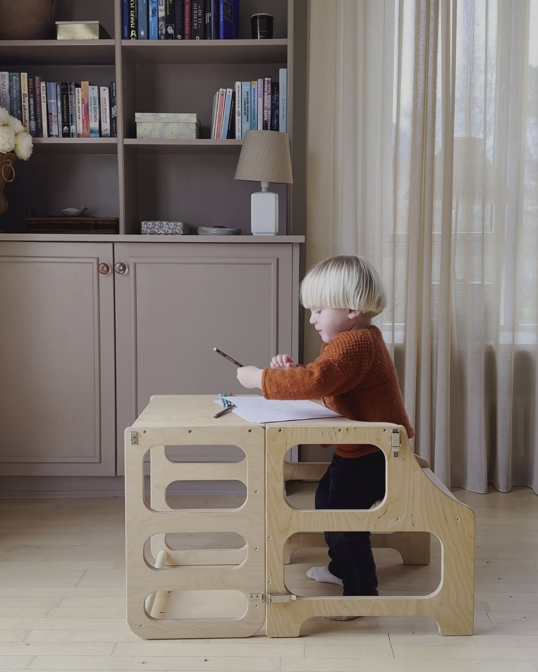 - Flip Læringstårn: Et alsidigt møbel, der bringer barnet op i højden og gør det nemt for dem at deltage i køkkenaktiviteter, kreative projekter eller daglige rutiner. Læringstårnets robuste design sikrer stabilitet og tryghed, mens det fleksible design kan tilpasses barnets behov.